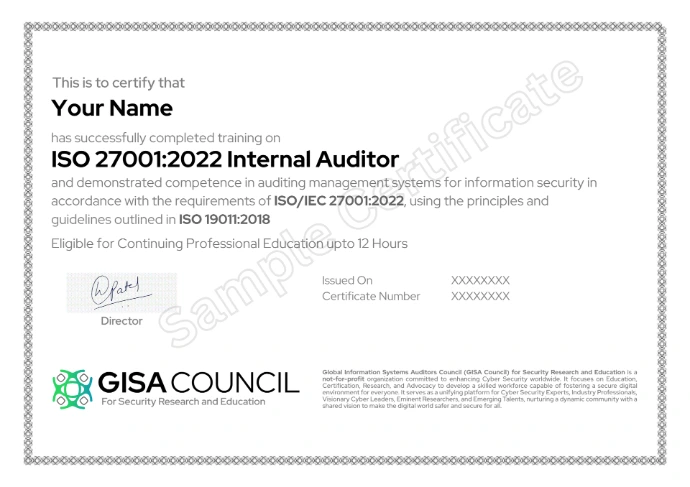 Upon successful completion of Internal Training on ISMS, the candidate will be awarded a certificate of completion from GISA Council for Security Research and Education.
