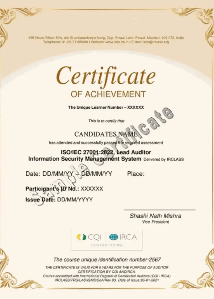 On successful completion of training and fulfilling assessment criteria, the candidate will be awarded a certificate which will entitle the candidate to be a CQI- IRCA Certified ‘ISO 27001 Lead Auditor’